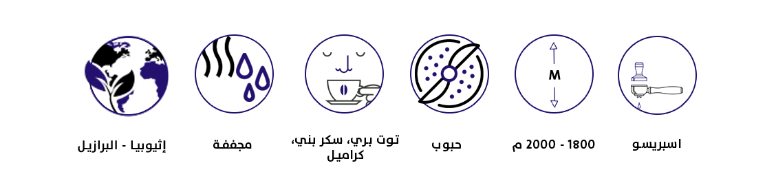 مزيج من محصولين مختلفين من إثيوبيا والبرازيل على ارتفاع يتراوح بين 1800 - 2000 متر، يتميز بإيحاءات ممتعة تتضح في نكهة التوت البري والسكر البني وتنتهي بنكهة الكراميل اللذيذة.
