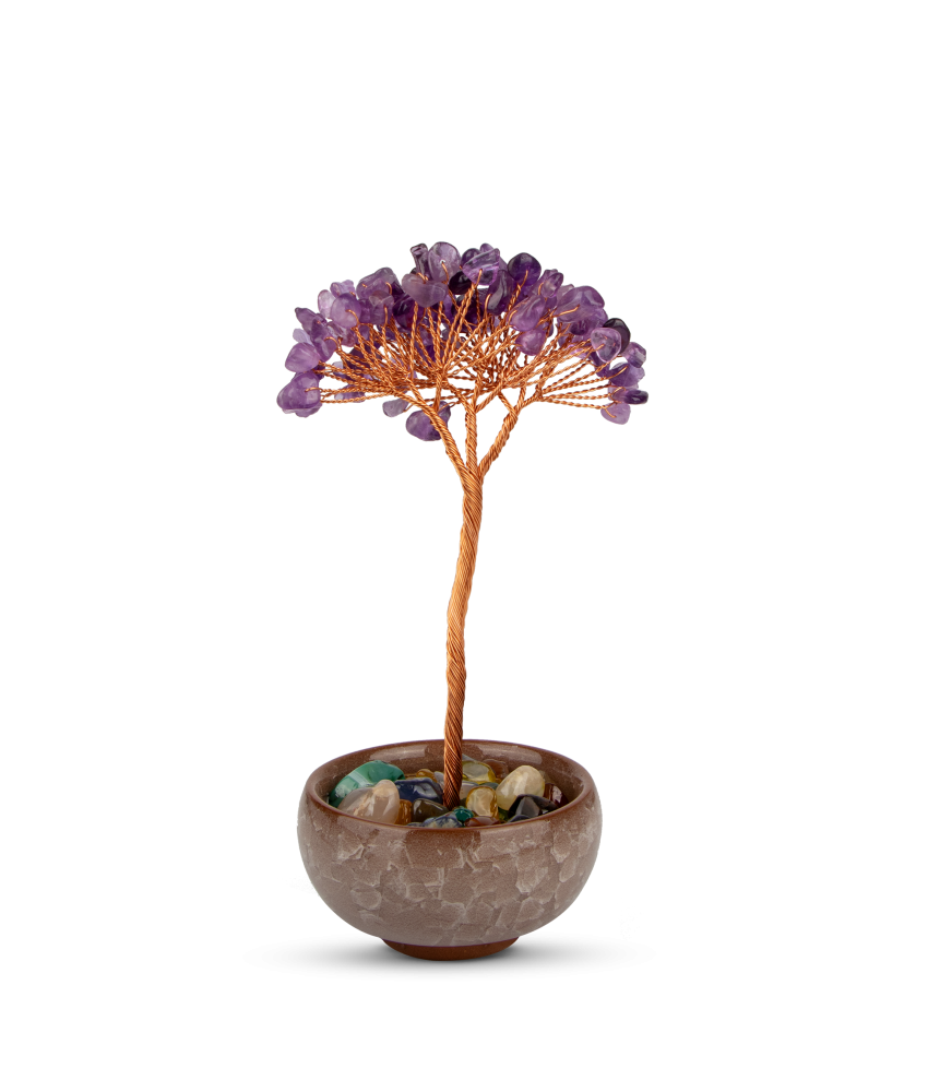 أضف لمسة من الفخامة والأنوثة إلى ركن قهوتك مع شجرة الزينة، التي تتميز بقاعدة زجاجية باللون البنفسجي المتوسط مع أغصان نحاسية أنيقة. في الأعلى، تتزين الشجرة بكرستالات باللون البنفسجي كالثمار، مما يضفي لمسة من الجمال والتألق على ديكورك.