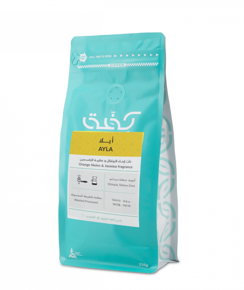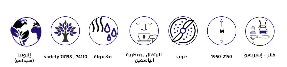 وصف المنتج : يأتي هذا المحصول من منطقة سيدامو في إثيوبيا حيث الخبرة والجودة في الإنتاج، تمت زراعته على ارتفاع يتراوح بين 1950-2150 متر عن سطح البحر، معالج بالطريقة المغسولة وتتميز إيحاءاته بنكهة فاكهية تتمثل في مذاق البرتقال بالإضافة إلى إيحاءات عطرية برائحة الياسمين.