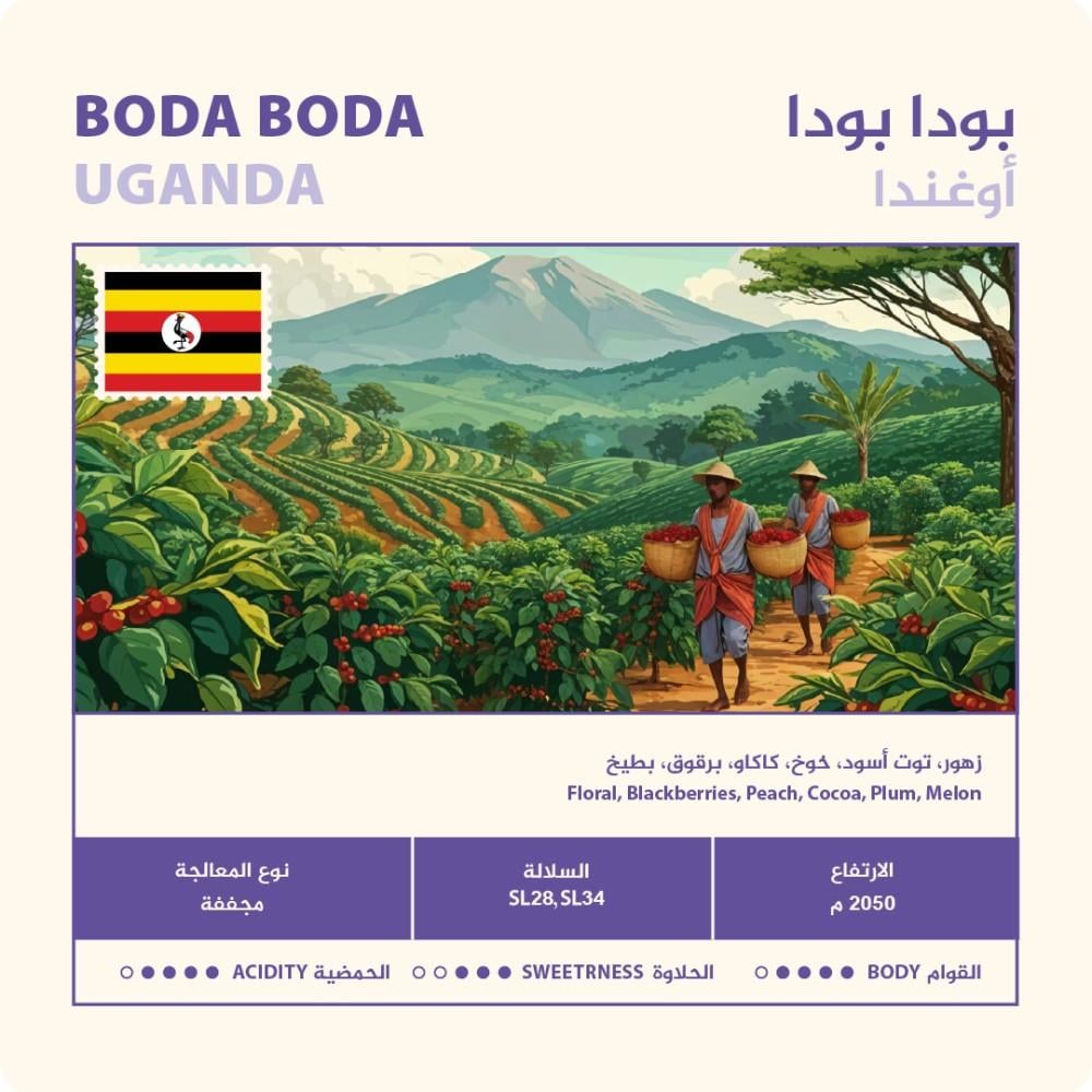 ☕ Uganda Boda Boda Coffee from Nahj Roastery features bright, fruity notes combining flavors of red plum, cherry, and berry, with a balanced acidity and a smooth finish reminiscent of black tea. Suitable for coffee lovers with a fresh, floral, and fruity character.